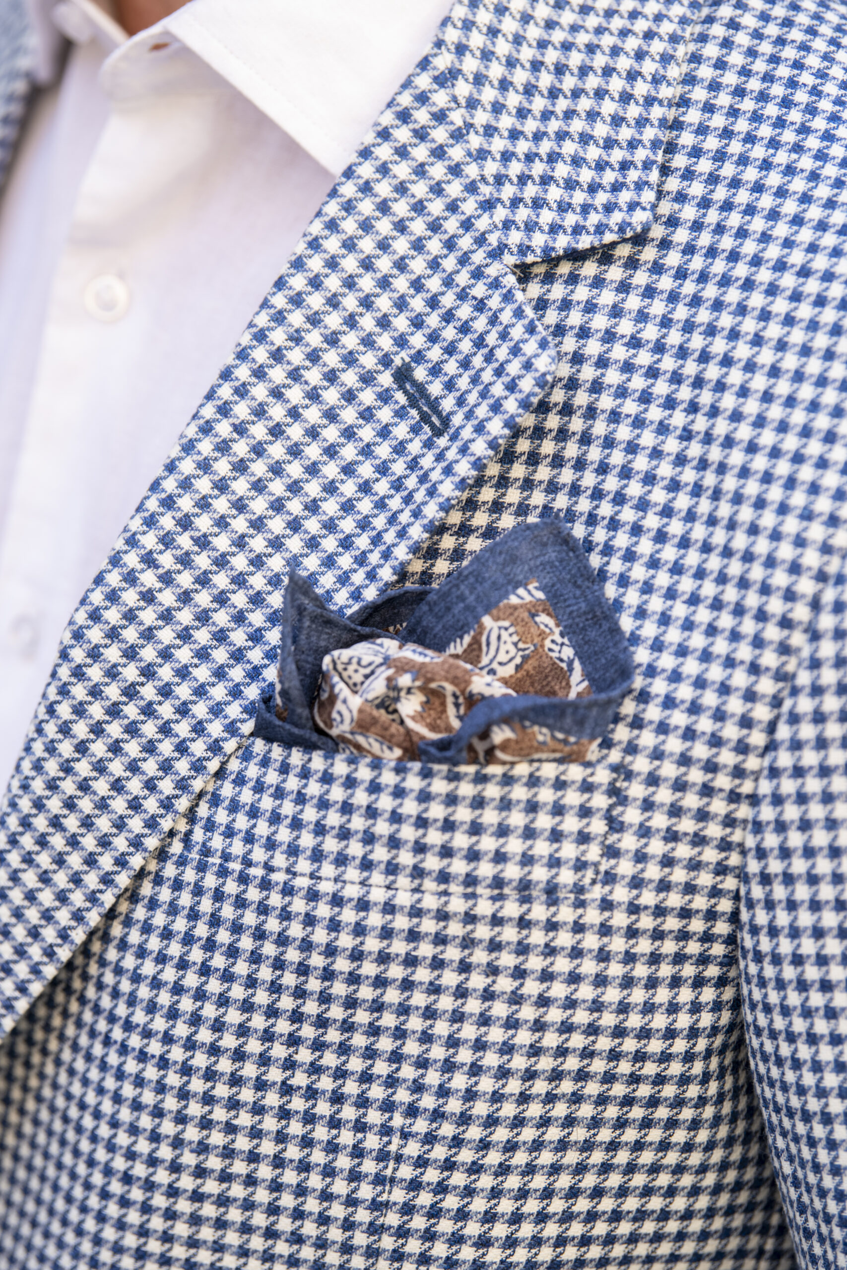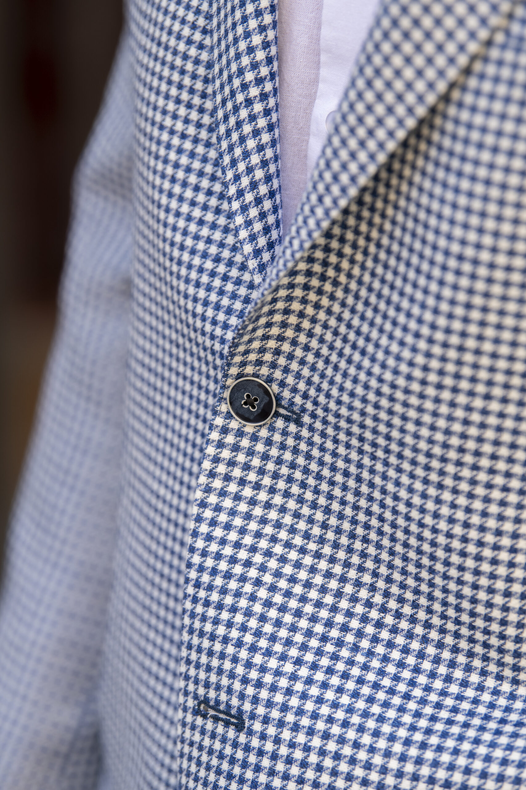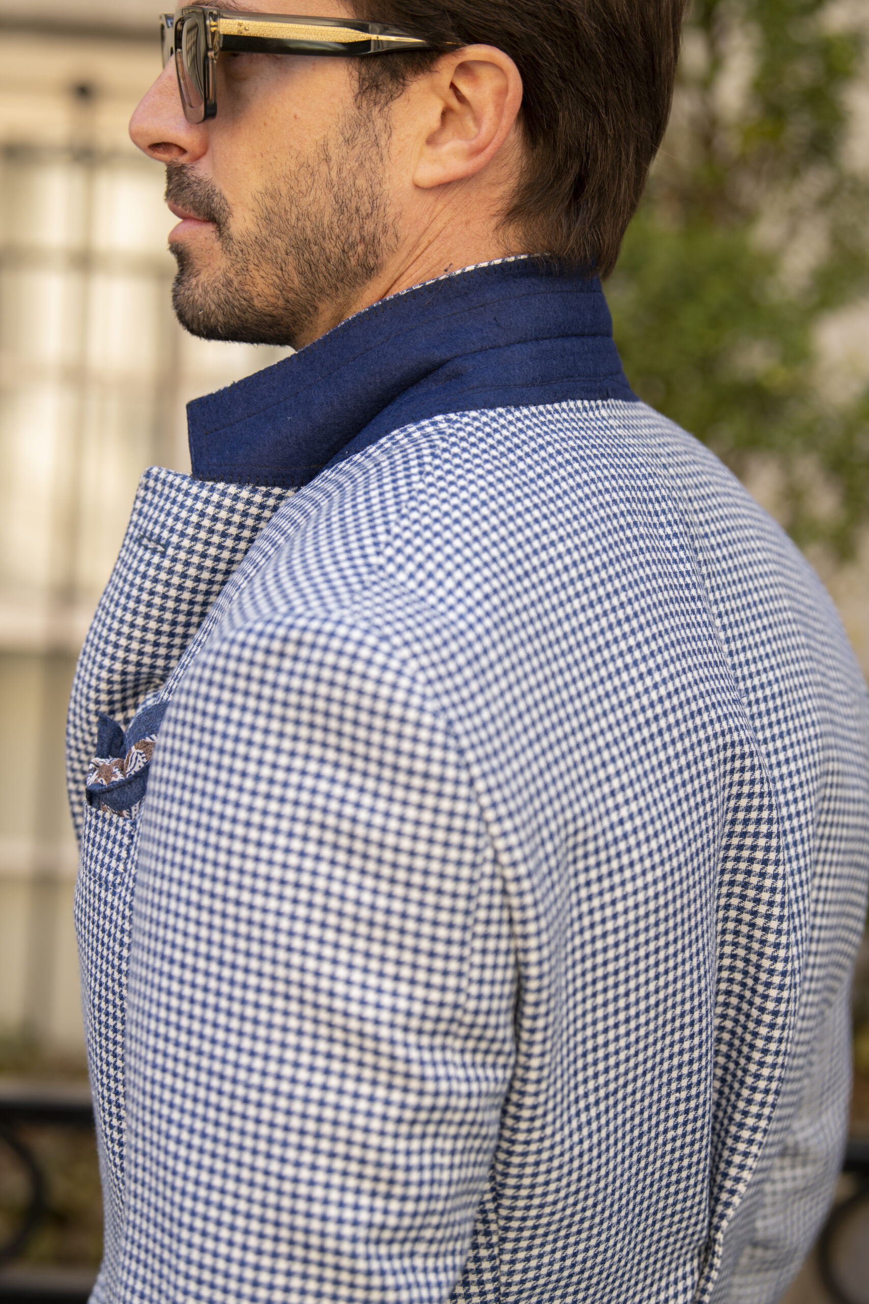 Made in Italy from REDA wool and linen, The Calder Jacket offers a refined balance of lightweight comfort and tailored sophistication. Showcasing a classic houndstooth weave, it features a two-button closure with navy buttons, notch lapel, chest pocket, and two front patch pockets for a relaxed yet polished look. Finished with a navy melton under-collar and cape lining, it reflects thoughtful craftsmanship throughout. Available in two tailored fits—“J” for Jack, a slim fit, and “G” for Gio, a regular fit—it ensures a perfect look for every gentleman.