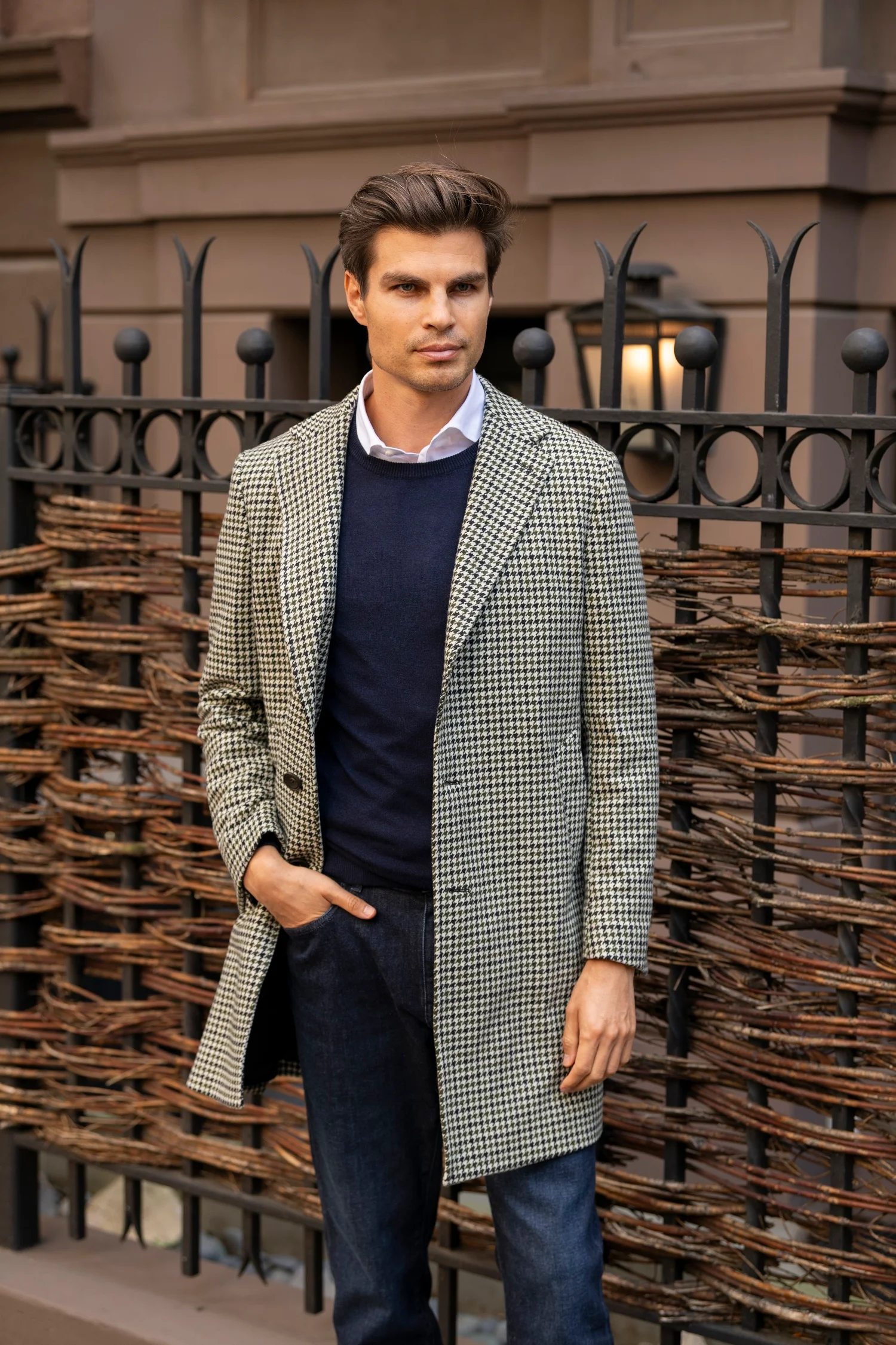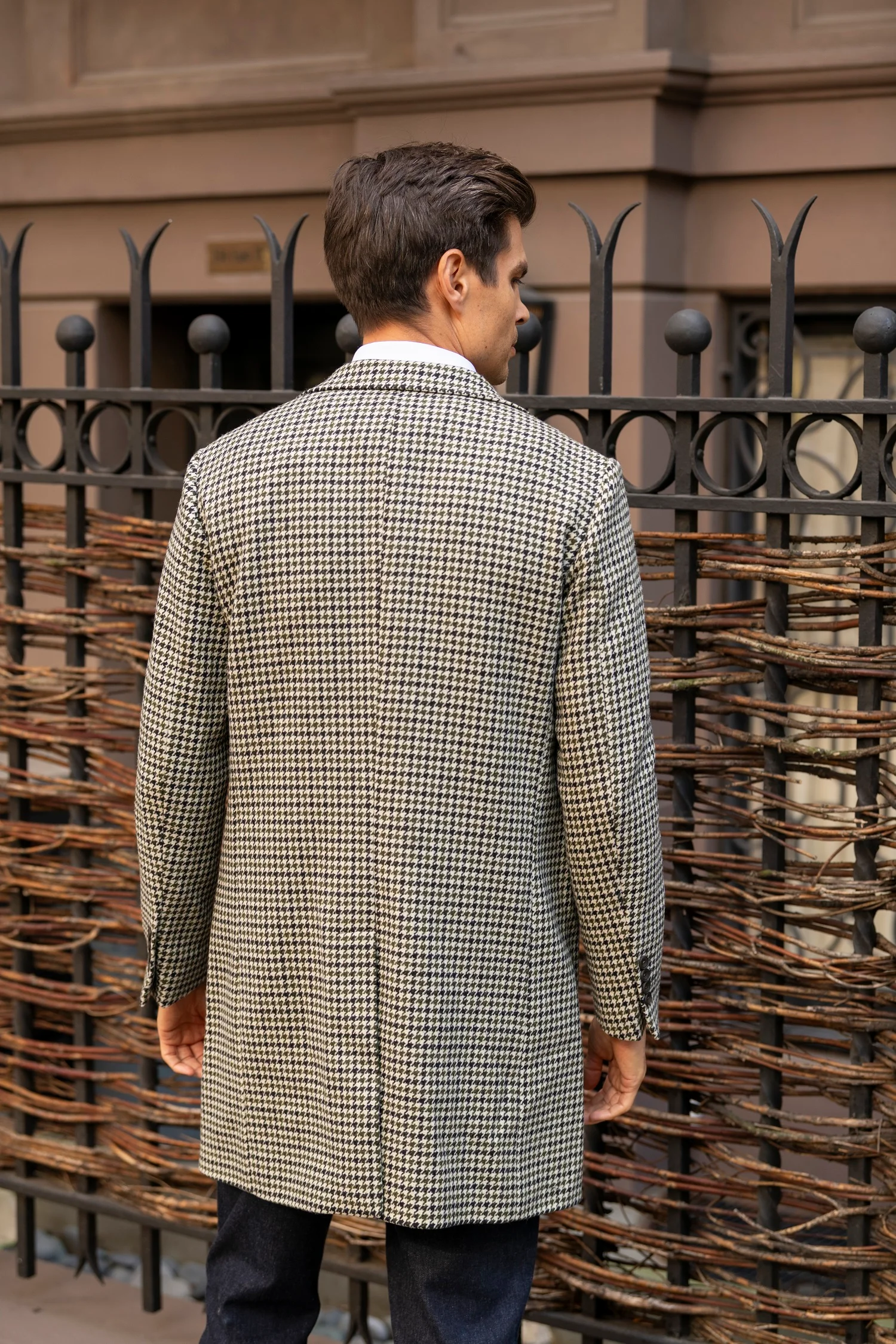 Made in Italy from a luxurious wool blend, The Kensington Overcoat features a classic houndstooth pattern set in a timeless, tailored silhouette. Designed with a three-button front closure, notch lapel, and single vent, it balances refined structure with comfortable ease. Fully lined for added warmth, it includes two front open pockets and a charcoal melton under-collar—a distinguished finishing touch.