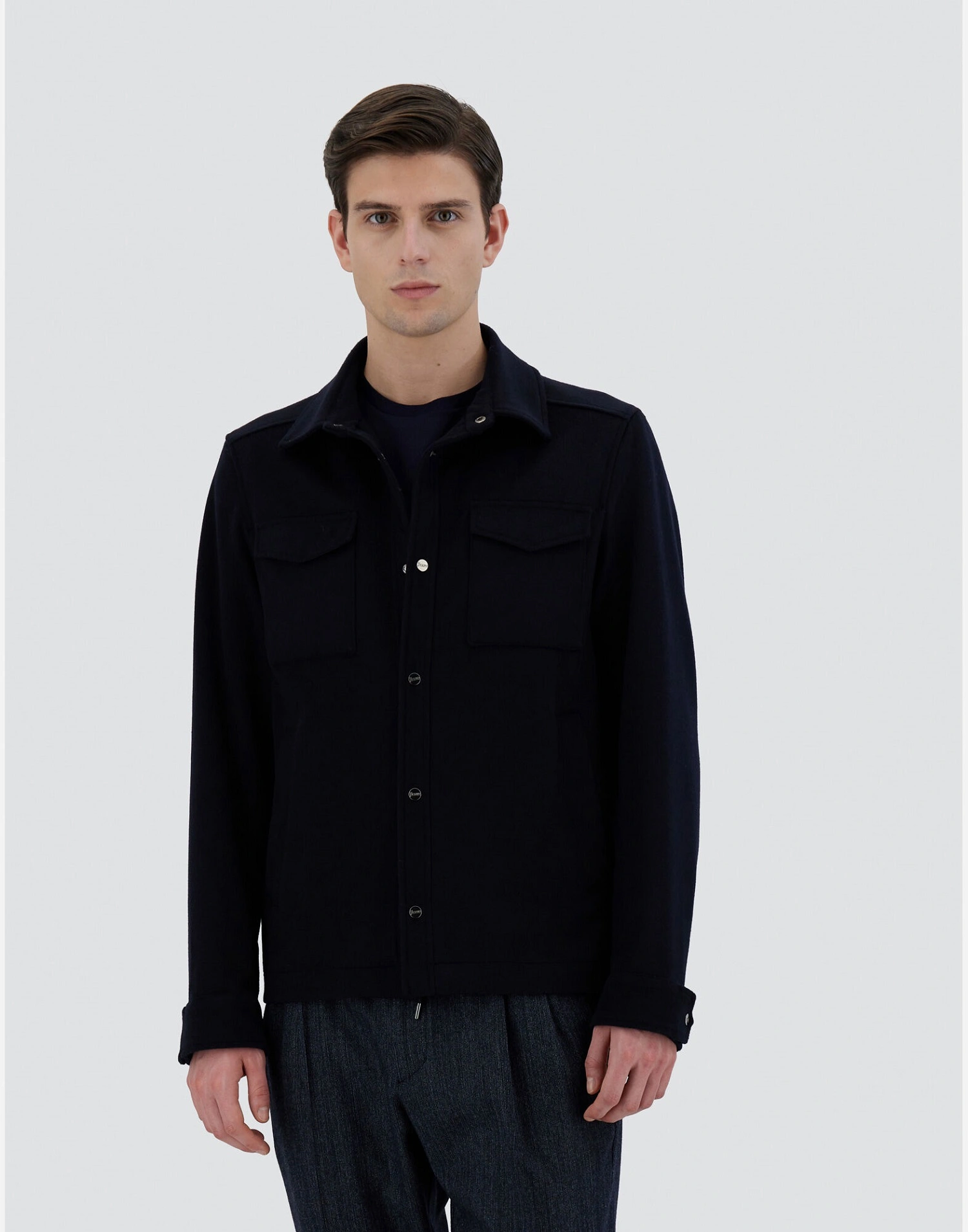 Crafted in Italy from a soft wool and cashmere blend with a refined matte finish, this shacket is the perfect light outerwear piece for the changing seasons. Designed in a regular fit, it combines functional detailing with understated sophistication for everyday wear.