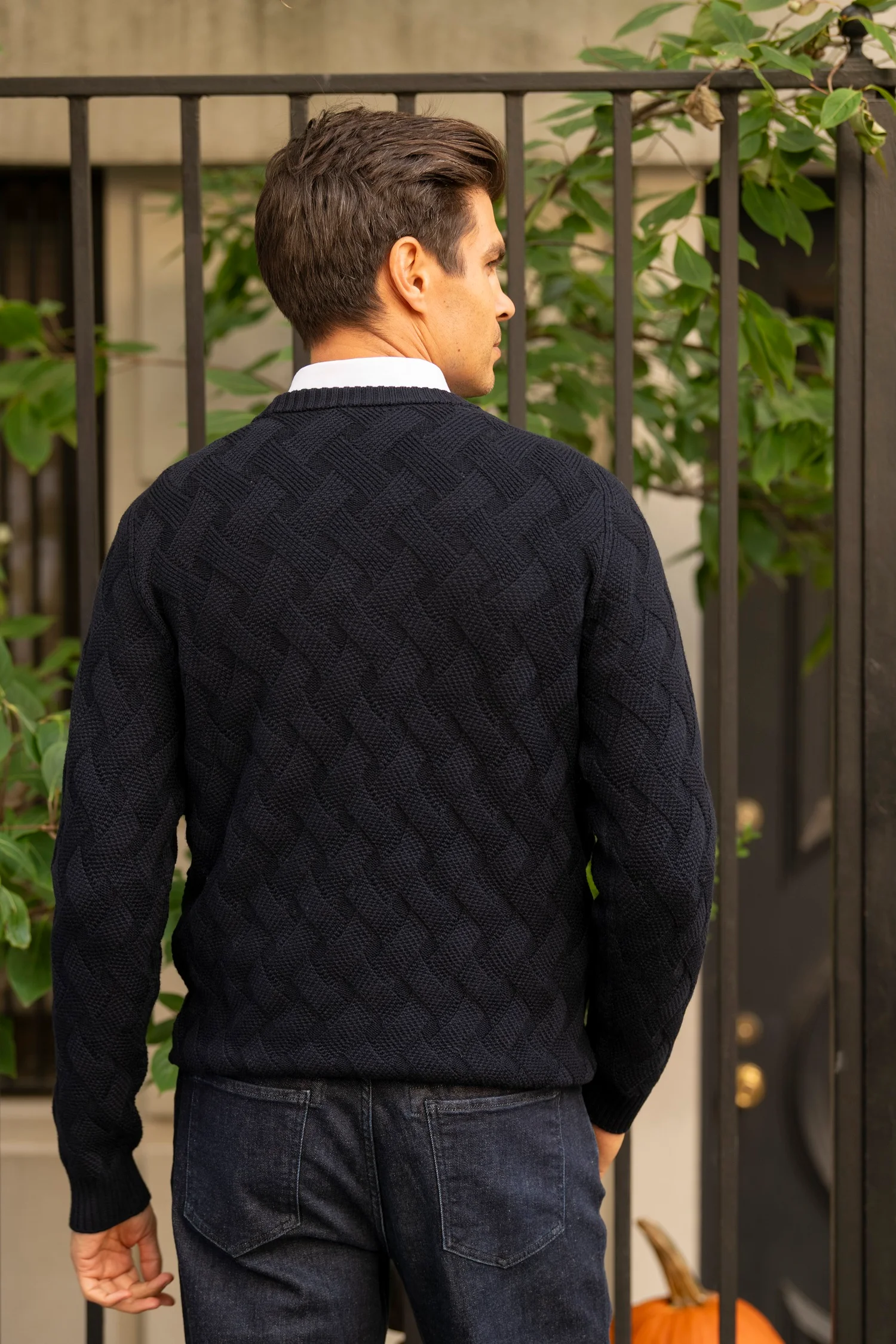 Crafted in Italy from fine merino wool, this crewneck features a distinctive basket-weave texture that adds depth, dimension, and refined visual interest. Designed with a ribbed collar, cuffs, and waistband, it offers a polished fit and a luxuriously soft feel—an elevated essential for the cooler season.